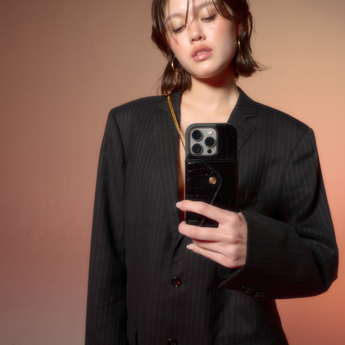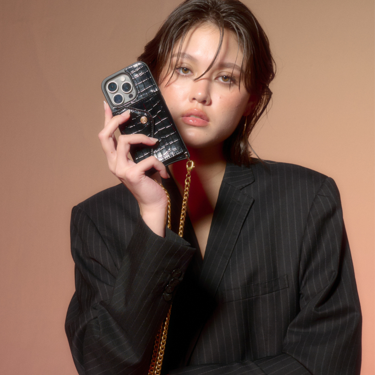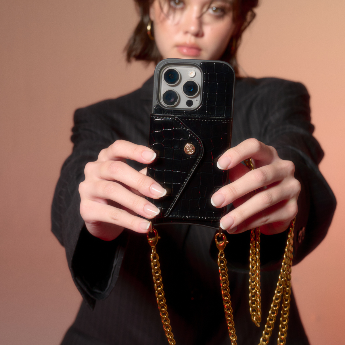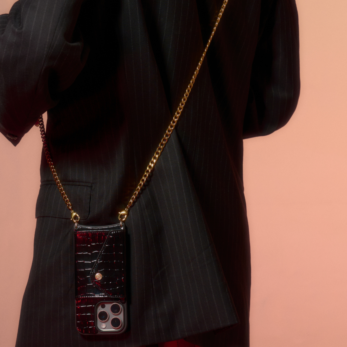 The Allegra Hands-Free Crossbody, expertly crafted from premium vegan leather with exquisite croc embossing, features a detachable shoulder strap accented by a stainless steel, vacuum-plated, gold-colored snake chain. More than just an accessory, this piece stands as a testament to luxury and functionality, epitomizing elegance and refined simplicity.