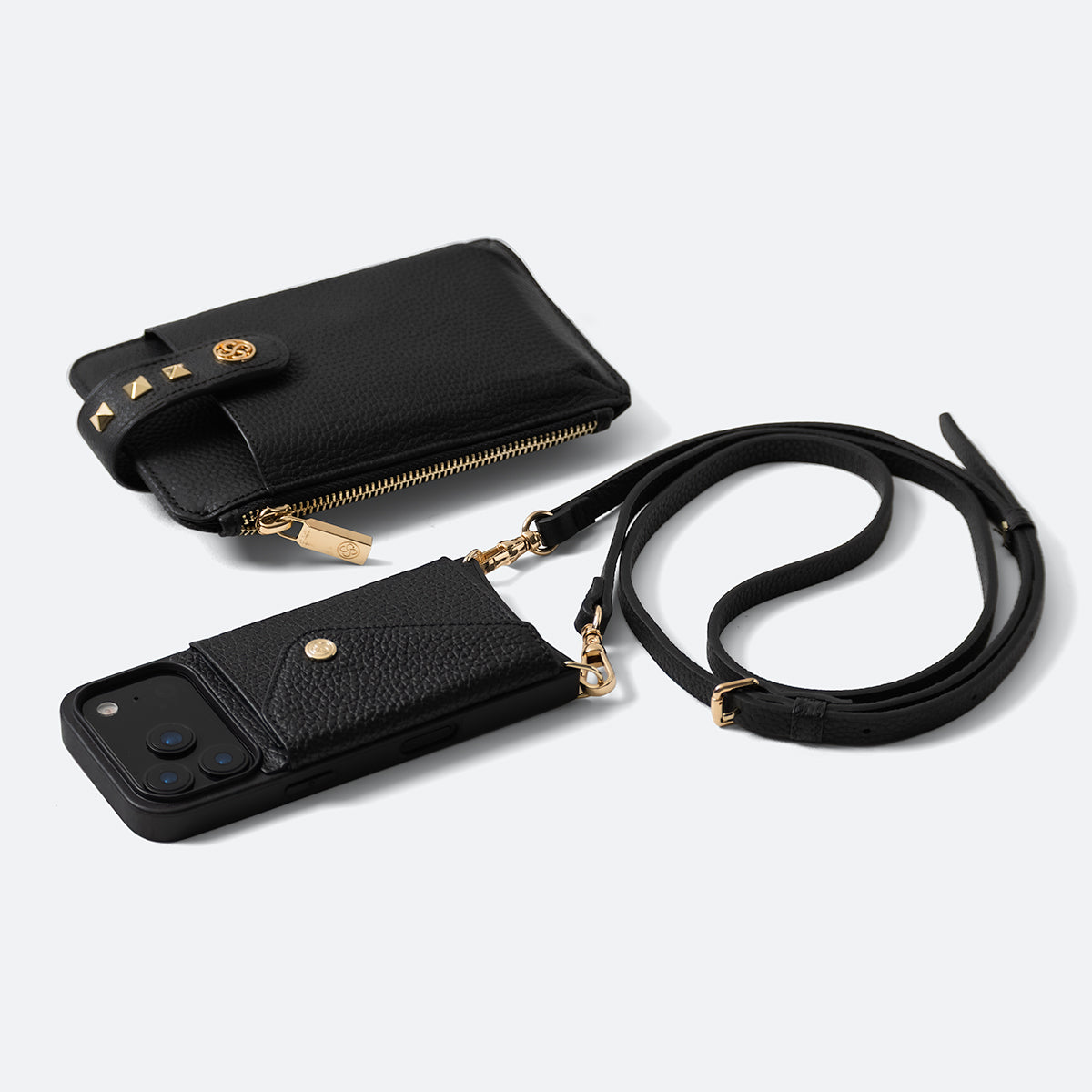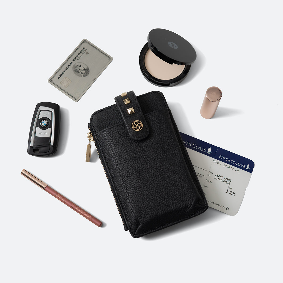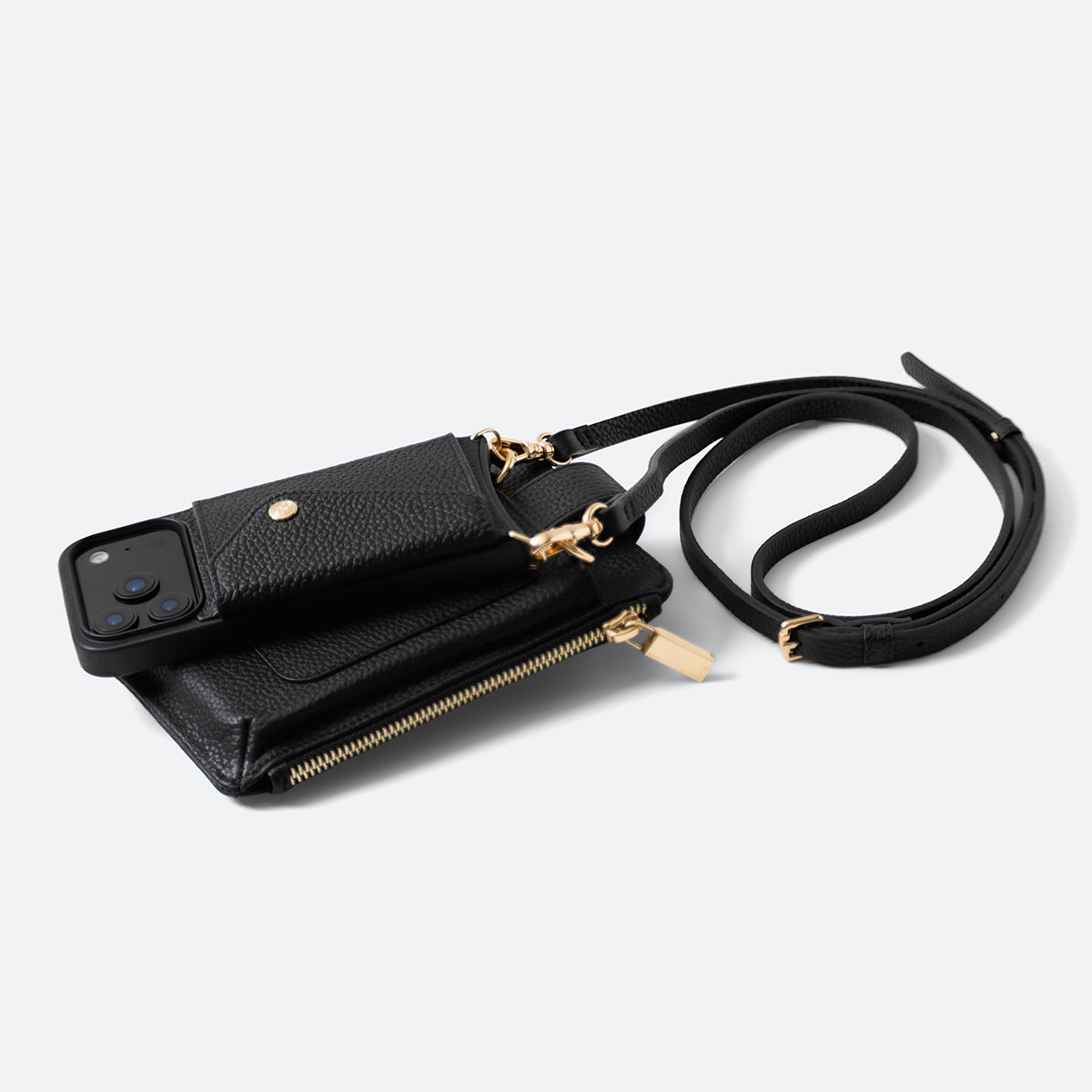 The Borsa Tracolla, the embodiment of Italian elegance and practicality.This crossbody phone bag, meticulously crafted from luxurious black pebbled leather, accommodates any phone size and small items.With a handy card slot on the back and a zippered wallet that can house your passport, it's a minimalist accessory that marries style and function seamlessly.