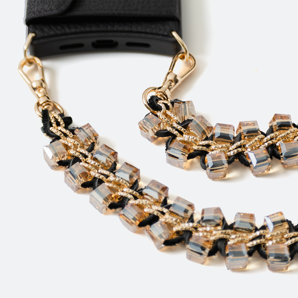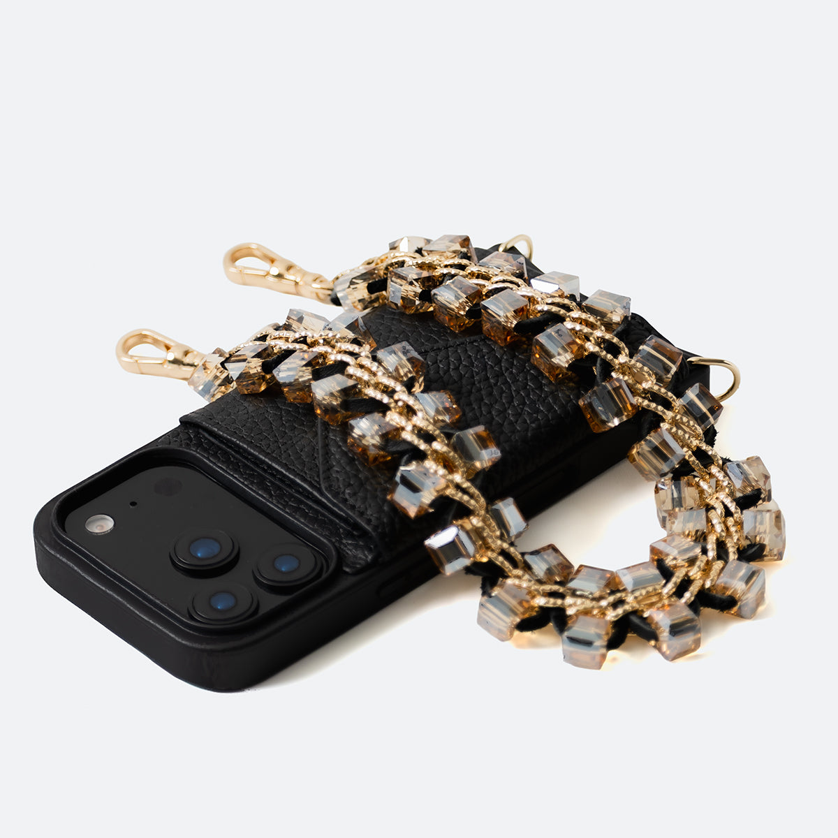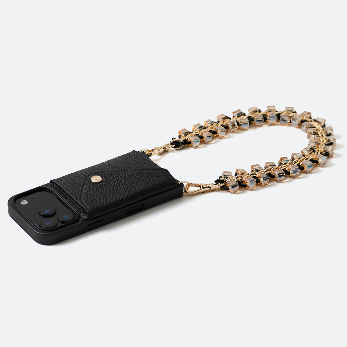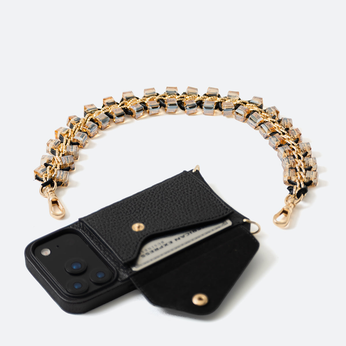 The Brillante phone case radiates understated luxury with its signature arrangement of finely cut glass crystals that capture and reflect light from every angle. A polished metal chain detail runs through the design, complementing its luminous, mirror-like finish. Each piece is crafted with a soft microfiber inner lining, and precision-moulded vacuum-plated hardware for lasting brilliance.