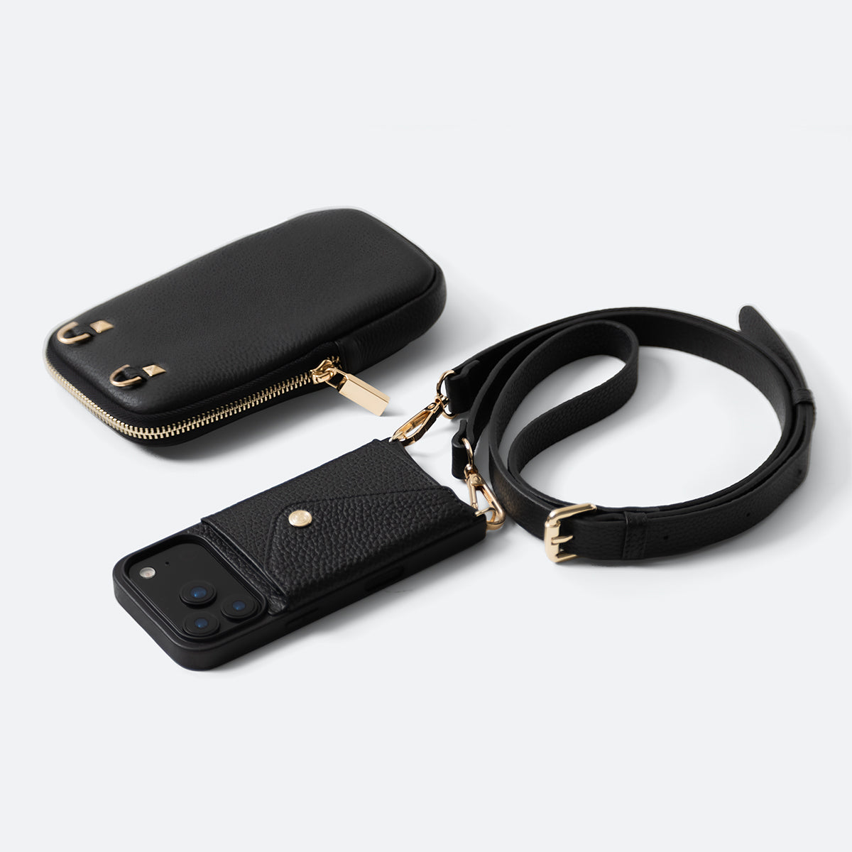 The Imogen set, where spaciousness meets minimalist elegance. This chic accessory showcases a modern D-ring element paired with a secure zipper finish. Delicately fashioned from authentic black pebble leather and adorned with gold-tone embellishments, it's more than just a pouch. With room for everything from cards and cash to makeup and chargers, it seamlessly transitions from a detachable accessory to a standalone clutch.
