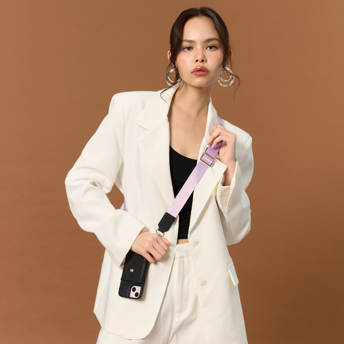 The Elettra Lanyard features a striking 20.2" strap, expertly crafted from vibrant white nylon and supple premium black leather, combining sophistication with practicality. Designed to be effortlessly worn around the neck, it elevates your ensemble with a refined yet bold statement. Perfect for those who embrace modern elegance with a hint of edge, this accessory is the ideal complement to any fashion-forward wardrobe.
