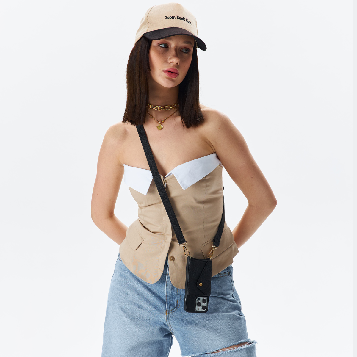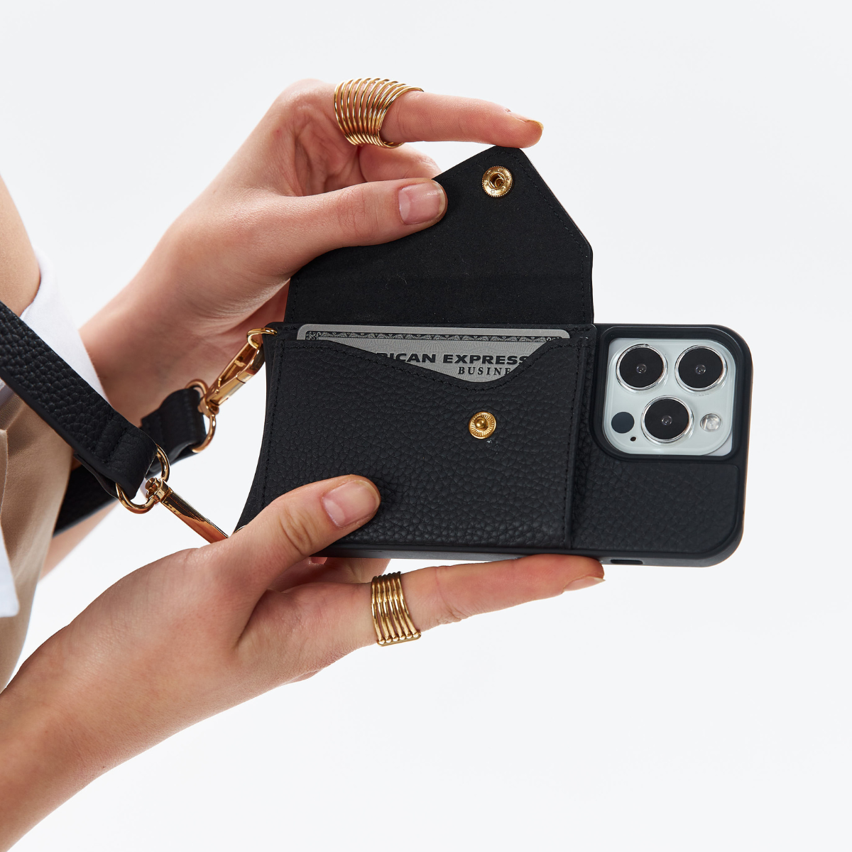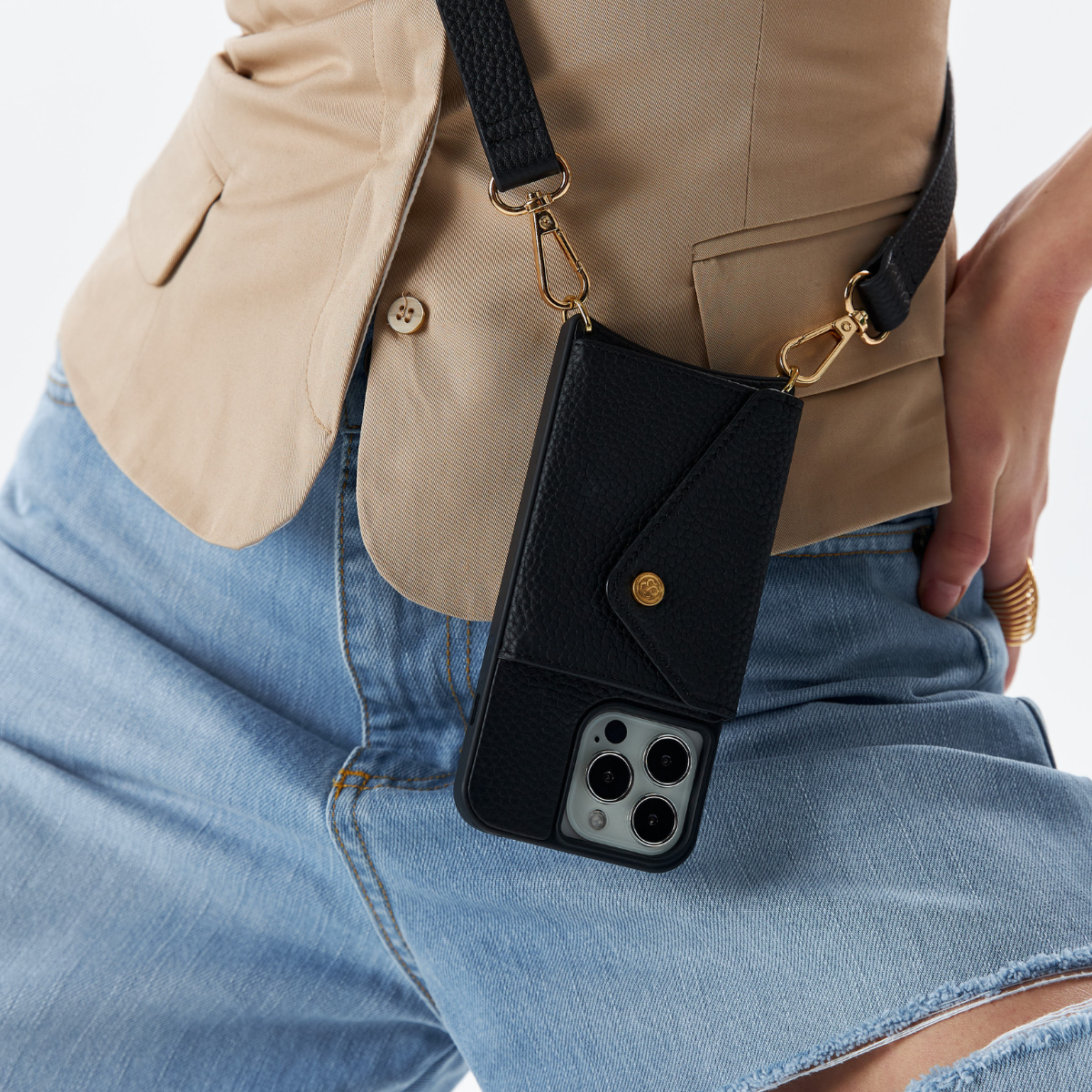 The Imogen Elegant Wide-Strap Crossbody iPhone Wallet is a timeless classic that embodies sophistication and minimalist charm. It is meticulously crafted from genuine black pebble leather and embellished with delicate gold-tone accents, striking the perfect balance between style and functionality.