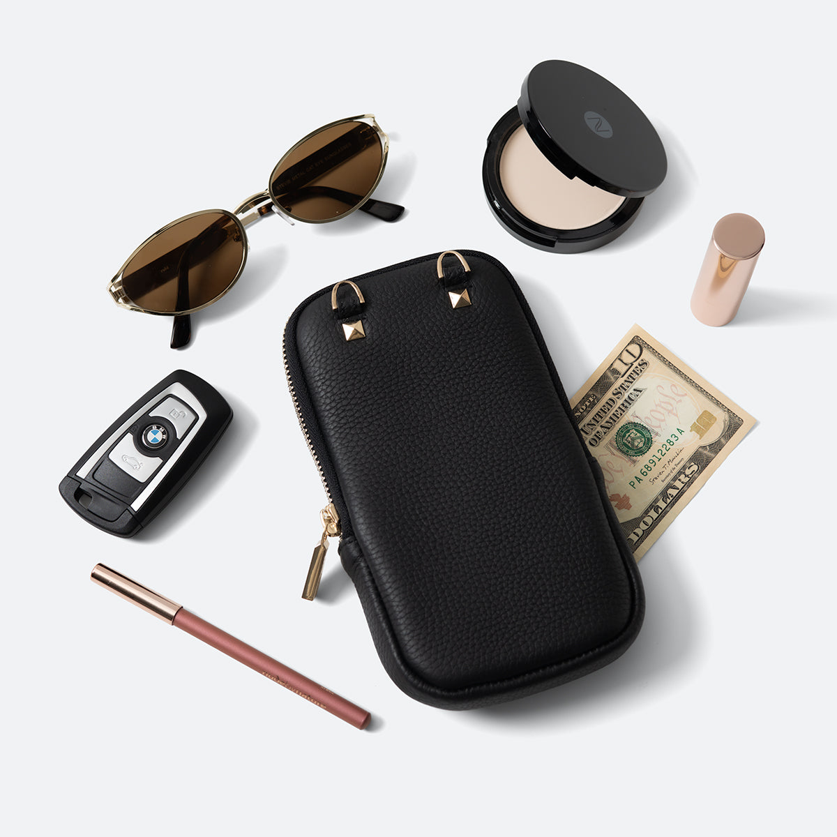 The Imogen set, where spaciousness meets minimalist elegance. This chic accessory showcases a modern D-ring element paired with a secure zipper finish. Delicately fashioned from authentic black pebble leather and adorned with gold-tone embellishments, it's more than just a pouch. With room for everything from cards and cash to makeup and chargers, it seamlessly transitions from a detachable accessory to a standalone clutch.